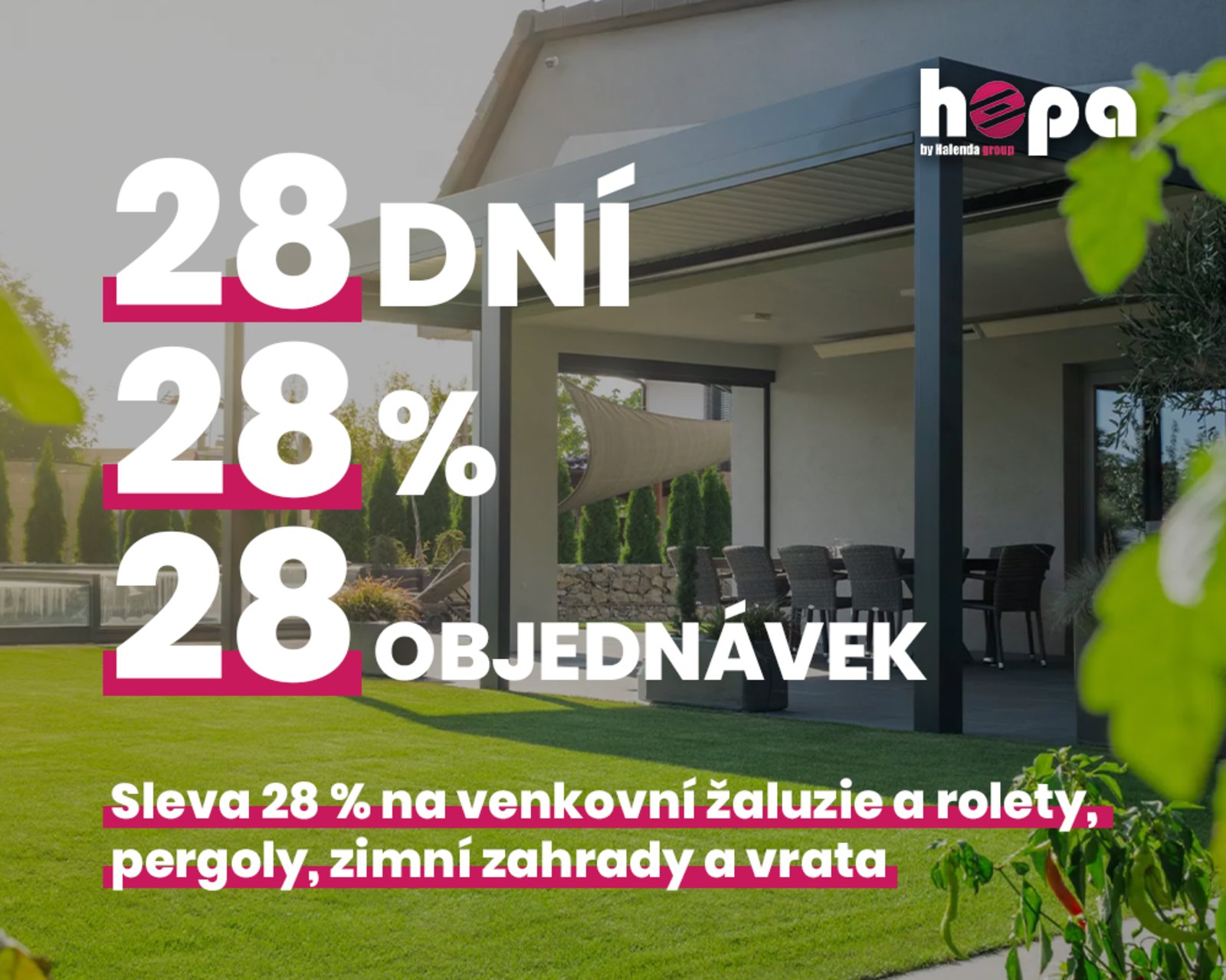 Únor má jen 28 dní. A právě proto jsme připravili jasnou a férovou nabídku - sleva 28 % po celý únor na prvních 28 uzavřených objednávek, a to na sortiment venkovních žaluzií a rolet, pergol, zimních zahrad a garážových vrat.
