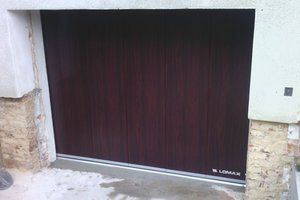 Dodávka a montáž bočně posuvných garážových vrat PRAKTIK. Barva Mahagon 205, ovládání pohonem MARANTEC Comfort 260/SZ12.