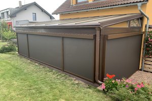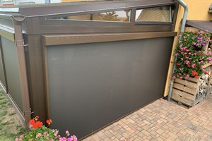 Ovládání elektropohonem SOMFY s dálkovým ovládáním (protokol IO). Textilie Champagne SWK 711, barva konstrukce RAL 8014.